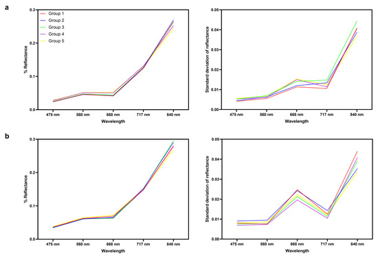 Reflectance variations of multispectral data among the five genotypic groups for (a) the early acquisition (17 May), and (b) the late acquisition (1 June). The right panels show the standard deviation of canopy reflectance.