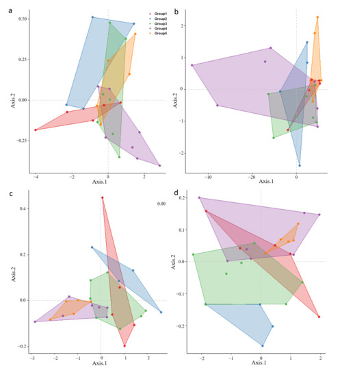 Metric multidimensional scaling analysis (MDS) of the spectral data for (a) leaf hyperspectral measurement, (b) canopy hyperspectral measurement, (c) early multispectral measurement and (d) late multispectral measurement (via metric dimensional scaling into k = 5 dimensions), with boundaries indicating the use of alpha hulls.
