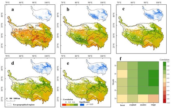 In the view of lagged months, the 0-month lag had the largest area (43.7% and 33.39%) during May and July, including alpine grassland of IC2, IIC1, IC1, IB1, and IIC2 (Figure 4). The rmax−lag at time-lags of one-month occupied most of the area (34.17%, 35.24%, and 43.7%) during other months (June, August, and September). These areas were mainly located in alpine grasslands (IC2, IC1, and IB1) and temperate mountain steppes (IIC1 and IIC2).