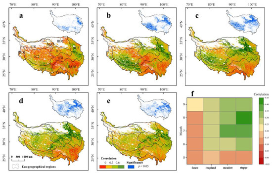 Spatial pattern of the largest correlation coefficient rmax−cum between SPEI and NDVI and significance (p < 0.05) from 2000−2018. (a) May; (b) June; (c) July; (d) August; (e) September. The largest correlation coefficient rmax−cum between SPEI and NDVI of different vegetation types on the QTP (f).