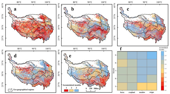 At different stages of the growing season, the cumulative effects showed significant spatial differences between different time scales (Figure 6). In May, 48.5% of the QTP presented one-month cumulative effect to drought. However, the rmax−cum at a cumulative effect of three months gradually dominated from June to September. The response areas were distributed in the sub-polar and temperate semi-arid grassland of the QTP (IC2, IC1, IIC1, IIC2, and IIAB1), and the distribution of these areas expanded gradually.