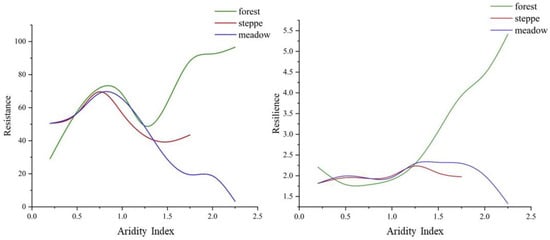 The resistance and resilience of different vegetation types are clearly different due to their physiological structure, internal physiological mechanism, and strategies for coping with extreme climate events [,]. Additionally, differences in environmental conditions and species diversity lead to regional differences in the stability of the same vegetation type [,]. We found significant differences in resistance and resilience under different dry and wet conditions (Figure 7), which confirmed the above statements. Figure 8 illustrates that the resistance of the areas with AI lower than 0.75 (arid, semi-arid, semi-humid regions) continued to rise, while the resistance of the areas with AI higher than 0.75 (humid region) showed a negative correlation with AI on some intervals. Vicente-Serrano et al. [] obtained similar results that sub-arid and sub-humid communities can withstand water deficits. The relatively high resistance of semi-arid and sub-humid regions also makes the difference in coverage after vegetation drought restoration smaller, so the resilience was relatively low. The resilience of areas with AI higher than 1 was positively correlated with AI. It may be that the higher biodiversity of the humid region enables vegetation to recover and even exceed original productivity as soon as possible after experiencing severe drought [,]. In addition, the intervention of the human activity makes the resistance and resilience of the crop higher than natural conditions. This is because crops planted on farms are typically chosen to be more flexible and the breeding of the species, timely meteorological monitoring, and artificial water supplement (irrigation) also greatly increased the adaptation of plants to climate change.