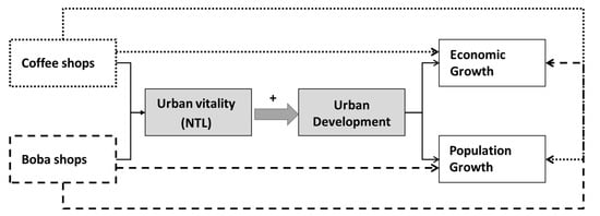 Although boba shops have grown in popularity worldwide, there has been little research examining how they relate to urban growth and vitality. Most studies on boba tea have looked at its connection to customers’ mental health or buying patterns [,]. Even though bubble tea shops and coffee shops are comparable, there has been very little research looking at the connection between bubble tea shops and urban vitality or, more specifically, urban development. This study aims to fill this research gap and extends the existing research by comparably looking at the spatial association between coffee, boba shops and urban vitality, and further, their relationship with different aspects of urban development (Figure 1).