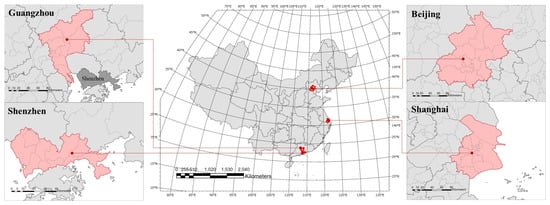 The studied cities include Beijing, Shanghai, Guangzhou, and Shenzhen, playing important roles as China’s financial, political, innovation, and trade centers, respectively (Figure 2). According to the national bureau of statistics, these are the top four cities in China with the highest regional GDP in 2021 []. Beijing and Shanghai are two economic development centers, as the capital city and the frontier of foreign trade since the 1900s, while Guangzhou and Shenzhen are two development engines that have newly evolved since the reform and opening in 1979. Specifically, Beijing is known for its long history, prominent political and cultural position, and its integrated industrial structure, which includes the production of electronics, machinery, chemicals, light industry, textiles, and cars []. Shanghai is considered a global financial, trade, economic, and shipping hub with an increasing number of highly educated and skilled people []. Both Guangzhou and Shenzhen are located in Guangdong province and the Guangdong–Hong Kong–Macao Greater Bay Area—the largest urban agglomeration in China, previously known as the Pearl River Delta. The urbanization in Shenzhen and Guangzhou is largely driven by foreign investment, thus attracting migrant workers from around the nation. Guangzhou is the largest city and the political, economic, and cultural hub of Guangdong Province []. Shenzhen was once famous for its manufacturing industry, and was known as the world’s factory, whereas it is now gradually transforming into the innovation center of China.