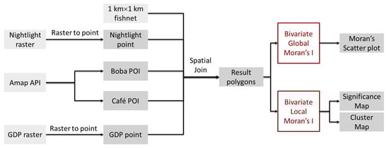 Figure 3 shows the workflow of bivariate Moran’s I used in the study. We first transformed the nightlight raster to points with values and created four 1 km × 1 km fishnets that overlap with the four city boundaries. We chose to set 1 km fishnets, considering that, on the one hand, the resolution of the used NTL, GDP and population data is 1000 m, while on the other hand basing the choice on the size of an ordinary neighborhood unit of approximately 160 acres, defined by [], which is about 800 m × 800 m square. Second, for each year, we spatially joined the count of boba shop POI, count of coffee shop POI, mean value of the nightlight point, and mean value of GDP to each unit of the fishnet and obtained four resulting polygons for cities with the information above embedded in each 1 km × 1 km fishnet unit. We then moved the analysis platform to GEODA to determine the global and local bivariate Moran’s I estimate for spatial correlation analysis. All the spatial data are projected into the projected coordinate system of WGS 1984 UTM Zone 50 N.