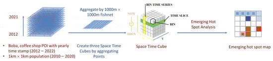 The preparation step of the emerging hot spot analysis is performed to create space–time cubes using 2012 to 2022 yearly boba and coffee shop POI and a 2010–2020 population raster with timestamps. We aggregated the yearly POI points by the 1 km × 1 km fishnet polygon created for four cities and defined the time step interval as one year.