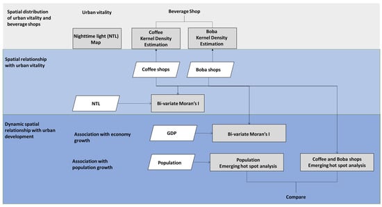 We integrated the methods and data listed in Table 3 into our analysis to better understand the dynamic spatial distribution of urban vitality and the relationship between boba/coffee businesses and urban vitality/development. To answer our first research question regarding the spatial distribution of urban vitality represented by NTL and beverage shops, we employed kernel density analysis to map their location. For the second research question on how boba and coffee shops represent urban vitality, we used bivariate Moran’s I analysis to observe their spatio–temporal global and local spatial association with NTL. In terms of our third research question on how the growth of boba and coffee shops relates to different aspects of urban development, we first investigated their spatial relationship with economic growth using bivariate Moran’s I analysis. We then compared the emerging hot spot analysis results among the growths of coffee shops, boba shops, and population to explore their spatial similarities and differences. The research workflow is shown in Figure 5.