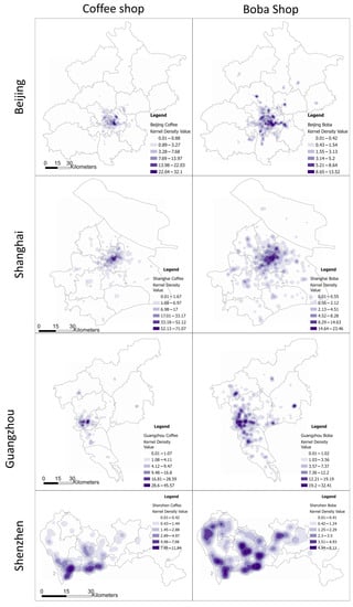 Kernel density analysis simulates the distribution of points and line sets in space by calculating the distribution density of different points and line sets in geographic space, so as to objectively reflect the agglomeration form of different elements in space. We used kernel density analysis to visualize the spatial clusters of boba and coffee shops in the four sampled cities (Equation (1)):