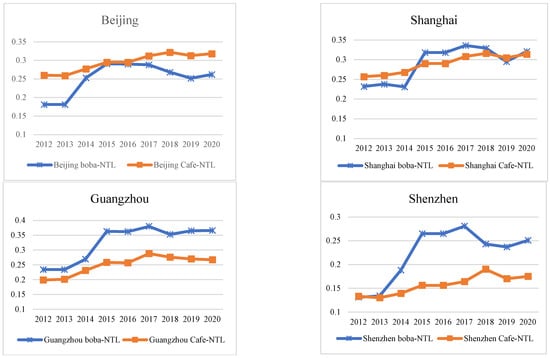 We conducted a bivariate Moran’s I analysis between the number of boba or coffee shops and nighttime light (NTL) intensity in Beijing, Shanghai, Guangzhou, and Shenzhen from 2012 to 2020. The larger the coefficient, the stronger the correlation between boba or coffee shop density and NTL intensity, further indicating a stronger association with urban vitality. The results are shown in Figure 8. In Beijing, between 2012 and 2020, coffee shops continuously show a stronger spatial correlation with urban vitality than boba shops. Conversely, in Guangzhou and Shenzhen, boba shops have a stronger spatial correlation with urban vitality than coffee shops (except that in Shenzhen in 2012, the coffee–NTL coefficient was slightly higher than the boba–NTL coefficient). In Shanghai, boba and coffee shops share a similar spatial correlation with urban vitality. From 2012 to 2014, coffee shops and urban vitality were more closely related than boba was. From 2015 to 2018, the tendency was reversed, and from 2019 to 2020, the coffee–NTL coefficient once more outpaced that of boba.