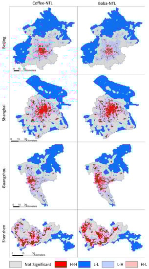 Over the last ten years, we further explored the dynamic spatial relationships between boba and coffee shops growth (2012–2019) and economic growth (2010–2019) for the four sampled cities in China on the basis of bivariate local Moran’s I analysis.