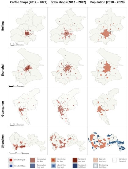Figure 11 shows the emerging hot spot map of boba and coffee shops (2012–2022) and population (2010–2020) for the four megacities. The emerging hot spot map shows the spatial distribution of hot spots and cold spots for the development of certain features over time. Comparing the results of boba and coffee shops, the emerging boba shops are scattered to a broader spatial extent than the coffee shops in all four cities. In terms of hot spot categories, we identified five categories of hot spot: persistent, consecutive, intensifying, new, and sporadic hot spots.