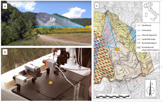 (a) Photo of the landslide with its surrounding environment. (b) Optical system used for multi-wavelength imaging. From left to right: Thermal infrared (TIR) camera, low- resolution visible camera for image selection and alignment among sensors, short wavelength IR (SWIR) camera, and smartphone for high-resolution visible imaging. (c) Geological map of the Poggio Baldi landslide area; [26] modified from [27]. In each panel, a yellow black-crossed dot indicates the position of the optical system including the TIR camera.