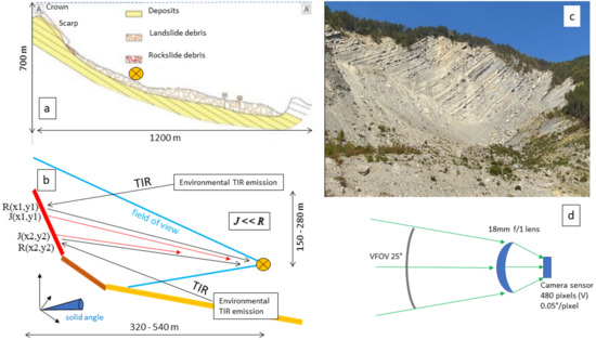 (a) Cut view of the landslide and its constituents with the distance of the zone that is affected by the landslide and the height of the landslide. (b) Theoretical model of the reflection and the emission of the elements of the landslide projected in the pixel (x,y) of the TIR camera detector with the distance and height of the detector respect the landslide. (c) Area corresponding to the field of view of the TIR camera, cropped from a photograph in the visible range taken with a smartphone in Figure 1c. (d) Geometrical optics model of the vertical field of view of the TIR camera.