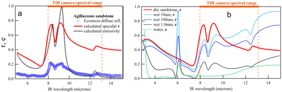 Finally, one should notice that, in all cases where emissivity dominates over reflectivity in Equation (4), the effect of water layers is probably not observable, as the spectral emittance of water in the 8–13 µm range is negligible if compared to that of rocks (compare the dotted curve in Figure 3a with the dotted curve in Figure 3b).