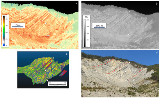 Finally, the purple zones in Figure 6a,b corresponding to the vegetation, both above the landslide crown and at the scarp foot, must be discarded from anomaly detection because they do not correspond to any portion of the rocky wall, nor are they at a different temperature to the rocky wall: they simply reflect less TIR radiation because of scattering by branches, leaves, and trunks.
