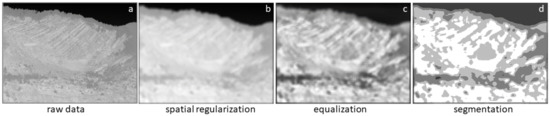 Coarsely speaking, a given function f at a resolution can be seen as a (discrete) grid of samples where local function averages are considered—the size of the average domain is proportional to . It turns out that a multiresolution approximation of f is composed of different and embedded grids. Very often, this operation becomes more intuitive by considering each one of these grids (say that at resolution ) as the orthogonal projection on the space . The latter includes all possible approximations at the resolution . Hence, starting from a given function f, its approximation at resolution is the projection on the space constrained to minimize the following quantity: . Usually, this operation can be achieved by convolving f with a dilated and translated version of a scaling function . The Haar scaling function [38] and just a few smoothed versions of f were used in this study. The Haar scaling function computes local averages of f with on a fixed window, different for each multiresolution level. Keeping in mind that in our study case , as it is a ’thermal image’ , we can consider at a given resolution , i.e., . The desired resolution is the one at which local details (e.g., the arenaceous strata) are disregarded while contrast sensitivity for the wet region is enhanced, as shown in Figure 5a.