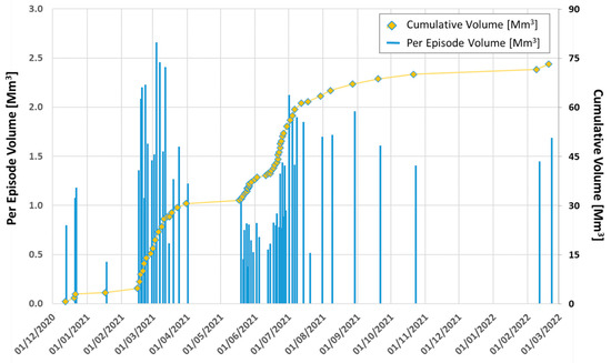 The volumes obtained using SEVIRI data from December 2020 to February 2022 are shown in Figure 1 (see Supplementary Materials S1). Looking at the volume distribution of the single events, two main eruptive phases can be recognized: one from February to April 2021 and one from May to October 2021. Six small events, from December 2020 to January 2021, precede the first phase and the two 2022 events, on 10 and 21 February, follow the second phase.
