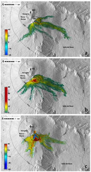 Estimating the distribution and volume of volcanic products emitted during a paroxysm is important to improve knowledge about magma supply, storage, and transport, as well as to derive input data, and calibrate and validate numerical models for hazard assessment [25]. In addition, keeping track of the erupted volume over time allows for the estimation of the state of the volcano and the volume of lava that could be erupted in the future [26,27]. In order to quantify volcanic products and map morphological variations, different techniques have been developed that use various source data acquisition methods, including LIDAR, laser scanner, photogrammetry from ground, airborne and unmanned aerial vehicles (UAVs, see, e.g., [28,29]). However, these techniques are often impractical both in remotely-located volcanoes, and at the summit area of active volcanoes that is often extremely windy and subject to high-risk phenomena. Another issue is the need for frequent updates in vast areas that make the use of these techniques very difficult and expensive.