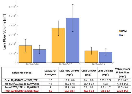 On top, volumes of the volcanic deposits from SEVIRI data (indigo bars) and DSM difference (orange bars) emplaced from 22 August 2020 to 26 February 2021, from 26 February to 27 July 2021 and from 27 July 2021 to 29 June 2022. The vertical black lines indicate the associated uncertainties. The table below summarizes the number of events, the lava volume and SEC changes from DSM difference, and the SEVIRI-derived volumes for the same three periods (black) and in total (red) (see Supplementary Materials S1).