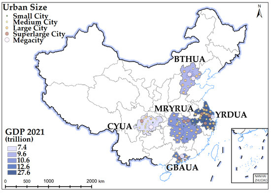 Spatial distribution of BTHUA, YRDUA, GBAUA, CYUA, MRYRUA. Megacity: the permanent urban population is more than 10 million. Super-large city: the permanent urban population is 5 to 10 million. Large city: the permanent urban population is 1 to 5 million. Medium city: the permanent urban population is 500,000 to 1 million. Small city: the permanent urban population is less than 500,000.