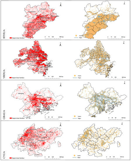 The complex spatial networks of BTHUA, YRDUA, GBAUA, CYUA, and MRYRUA are constructed as in Figure 4. The red patches represent the impervious surfaces, the yellow network nodes correspond to the centroid of the impervious surfaces, and the gray edge connects the neighbor nodes within the 15 km buffer radius to represent the spatial links. The number of nodes in the BTHUA, YRDUA, GBAUA, CYUA, and MRYRUA networks is 12,963, 4436, 987, 1747, and 2680, and the number of edges is 625,303, 53,827, 10,780, 12,902, and 16,834 respectively.