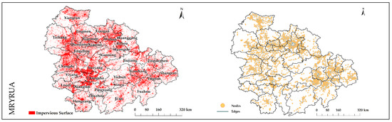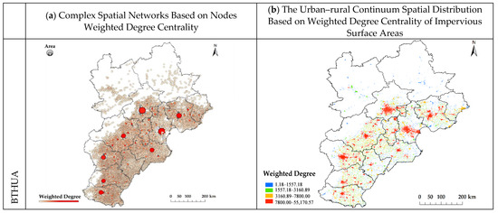 The basic feature of an urban agglomeration network is different spatial links that are aggregated to form different spatial patterns. Based on complex spatial network models and indicators, spatial links can be quickly extracted to identify spatial patterns. To extract the urban agglomerations multi-centers and urban–rural continuums, the spatial proximity is used as the edge weights to firstly obtain the node’s weighted degree centrality in this study. Second, the complex spatial network-based node weighted degree centrality is constructed (Figure 6a), and the Natural Breaks (Jenks) method is used to grade the color to obtain the multi-centers, which are represented by big red nodes. Last, the urban–rural continuum spatial distribution map based on the weighted degree centrality of impervious surface areas (Figure 6b) is constructed, and the Natural Breaks (Jenks) method is used to grade the color to obtain the urban–rural continuum. The red impervious surface areas represent the multi-centers of the urban agglomerations, orange impervious surface areas represent the city–town area, green represents semi-dense areas, and blue represents rural areas. The red and orange impervious surface areas are collectively referred to as urban areas in this study.