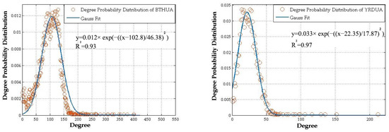 When the number of nodes is large, the degree of distribution of the small-world network can be approximated to a normal distribution. In this study, the complex spatial network degree distributions of BTHUA, YRDUA, GBAUA, CYUA, and MRYRUA approximately exhibit normal distributions (Figure 5), and the determination coefficients of R2 for the corresponding fitting functions are 0.93, 0.97, 0.81, 0.88, and 0.92, respectively.