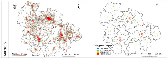 Complex spatial networks and urban–rural continuum spatial distribution based on weighted degree centrality.