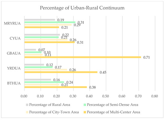The urban–rural continuum classification results (Figure 7) show that the percentage of GBAUA’s, YRDUA’s, BTHUA’s, CYUA’s, and MRYRUA’s urban areas decrease sequentially, at 0.82, 0.71, 0.59, 0.57, and 0.50, respectively. GBAUA has the highest percentage of multi-center areas while MRYRUA has the lowest percentage. The percentage of city–town areas of YRDUA is the highest and GBAUA’s is the lowest. The percentage of MRYRUA’s semi-dense areas is the highest, and GBAUA’s is the lowest. MRYRUA has the highest percentage in rural areas, and GBAUA has the lowest.