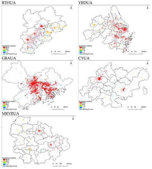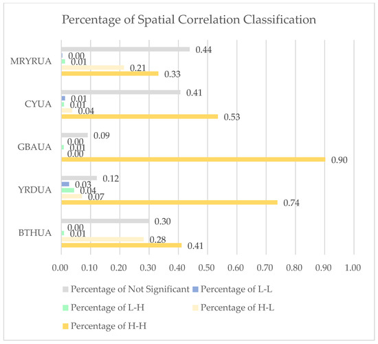 Adding HH and HL can obtain the urbanization global high-potential area H, and adding LH and LL can obtain the urbanization global low-potential area L. Based on the percentages of spatial correlation classification, it can be derived that the percentage of area H in the five urban agglomerations is much higher than that of area L. The percentages of area H for GBAUA, YRDUA, BTHUA, CYUA, and MRYRUA decrease sequentially, at 0.90, 0.81, 0.69, 0.57, and 0.55, respectively (Figure 9). The percentages of area L for YRDUA, CYUA (MRYRUA), and BTHUA (GBAUA) decrease sequentially, at 0.07, 0.02, and 0.01, respectively. Furthermore, the siphoning areas HL with high potential show significant performance while the siphoned areas LH with lower potential are not significant. The percentages of area HL for BTHUA and MRYRUA are 0.28 and 0.21, respectively, while those for YRDUA, CYUA, and GBAUA are close to 0. The percentages of LH of BTHUA, GBAUA, CYUA, MRYRUA, and YRDUA are close to 0. Specifically, the first four are about 0.01, and the latter is 0.04. In general, the percentages of H and HL for the five urban agglomerations are far greater than those of L and LH, respectively. The former is greater than 55% and 21% while the latter are both close to 0.