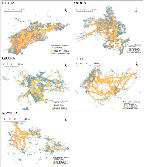 The high connectivity of urban agglomeration corridors is the key to the balanced development of urban agglomerations, which is another important structure of urban agglomerations. In this study, the urban agglomeration corridors are generated based on the betweenness centrality of complex spatial networks (Figure 10). The size of the nodes shows the degree of mediation effect. The larger the nodes, the stronger the mediation effect. The main corridors of BTHUA are two northwest–southeast corridors, i.e., Beijing–Baoding–Shijiazhuang–Xingtai–Handan and Tangshan–Tianjin–Langfang–Cangzhou–Hengshui–Xingtai–Handan. Hub nodes in the two corridors are staggered in geographic space and form triangles through bridge nodes to connect and communicate. There are three main corridors in YRDUA, one west–southeast corridor, and two north–south corridors, i.e., Chuzhou–Nanjing–Zhenjiang–Changzhou–Suzhou–Shanghai, Anqing–Chizhou–Tongling–Wuhu–Ma’anshan–Xuancheng–Huzhou–Jiaxing, and Hefei–Nanjing–Changzhou–Wuxi–Jiaxing. The north–south corridor starts from Yancheng and is distributed into two east–west corridors, i.e., Yancheng–Yangzhou–Qinzhou–Zhenjiang–Changzhou–Wuxi–Huzhou–Jiaxing and Yancheng–Nantong–Suzhou–Shanghai–Jiaxing. The five urban agglomeration corridors are distributed into three channels in Jiaxing: Jiaxing–Shaoxing–Jinhua, Jiaxing–Shaoxing–Taizhou, and Jiaxing–Shaoxing–Ningbo. There are many corridors in the YRDUA, which can be roughly divided into northwest–southeast and north–south trends. There are three main routes in the northwest–southeast trends, i.e., Chuzhou–Nanjing–Zhenjiang–Changzhou–Suzhou–Shanghai, Anqing–Chizhou–Tongling–Wuhu–Ma’anshan–Xuancheng–Huzhou–Jiaxing, and Hefei–Nanjing–Changzhou–Wuxi–Jiaxing. There are two main routes in the north–south direction, starting from Yancheng, and the distribution is divided into two east and west channels, i.e., Yancheng–Yangzhou–Qinzhou–Zhenjiang–Changzhou–Wuxi–Huzhou–Jiaxing and Yancheng–Nantong–Suzhou–Shanghai–Jiaxing. The GBAUA corridor is mainly composed of two ring-shaped corridors. The outer ring-shaped corridor is Huizhou–Dongguan–Guangzhou–Foshan–Jiangmen, and the inner ring-shaped corridor is Shenzhen–Dongguan–Zhongshan–Zhuhai. In CYUA, Chengdu and Chongqing are mainly connected by three main corridors from east to west. The first corridor is located in the northern part of CYUA, and it is composed of three sub-corridors, which from Mianyang, Deyang, and Chengdu converge to Suining and then distribute from Suining to Dazhou, Guang’an, and Chongqing. The second corridor is located in the middle of CYUA, and the key hub is Ya’an–Meishan–Neijiang–Chongqing. The third corridor is located in the south, which is Ya’an–Leshan–Yibin–Luzhou–Chongqing. The main corridors of MRYRUA are concentrated in its western region, and they are composed of north–south and east–west passages. The north–south urban corridor is Xiangfan–Jingmen–Tianmen–Qianjiang–Xantao–Jingzhou–Changde–Yueyang–Yiyang–Changsha, and the east–west corridor is Yichang–Qianjiang–Tianmen–Xantao–Wuhan–Ezhou–Huangshi. The eastern corridor is represented by two triangular components consisting of Jiujiang–Nanchang–Shangrao and Nanchang–Shangrao–Yingtan. To sum up, the results show that the corridors of BTHUA, YRDUA, and GBAUA have a high degree of integration, but there are giant corridor holes in the central part of CYUA and MRYRUA that reduce the connectivity between the east and the west.