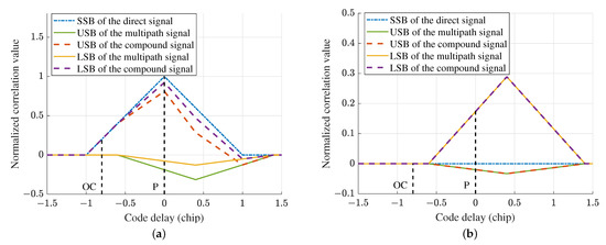 Equation (7) shows that the received BOC signal can be regarded as the sum of USB and LSB signals in the presence of multipath. The BOC multipath signal can be decomposed into two BPSK multipath signals located in the USB and LSB, respectively. Therefore, it is feasible to track the compound BOC signal with the DBT loop. However, multipath signals lead to tracking errors. It is necessary to analyze the effect of multipath on the DBT loop.
