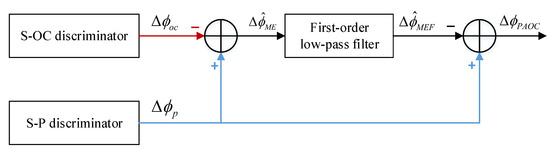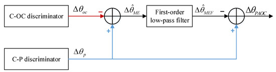 The processing described in Equations (18)–(21) can be modeled as a PAOC complementary filter, which is shown in Figure 4. When the smoothing constant is 1, is equal to , and the PAOC subcarrier estimate is equal to the S-OC discriminator output . That is to say, the OC technique is a special case of the PAOC technique with a smoothing constant of 1.