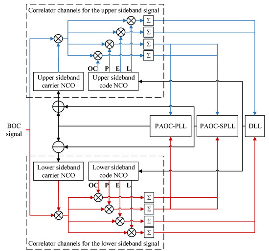 Figure 6 shows the implementation architecture of the PAOC technique in the DBT loop, which consists of four main parts: correlator channels, a PAOC-PLL for the carrier, a PAOC-SPLL for the subcarrier, and a DLL for the code. The S-OC discriminator, S-P discriminator, and PAOC complementary filter are implemented in the PAOC-SPLL. The C-OC discriminator, C-P discriminator, and PAOC complementary filter are implemented in the PAOC-PLL.