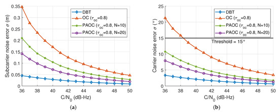 Equation (21) shows that the PAOC subcarrier estimate contains no multipath error. Moreover, the thermal noise error of is smaller than that of but lager than that of .