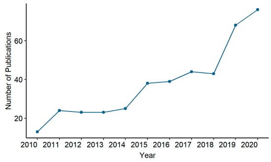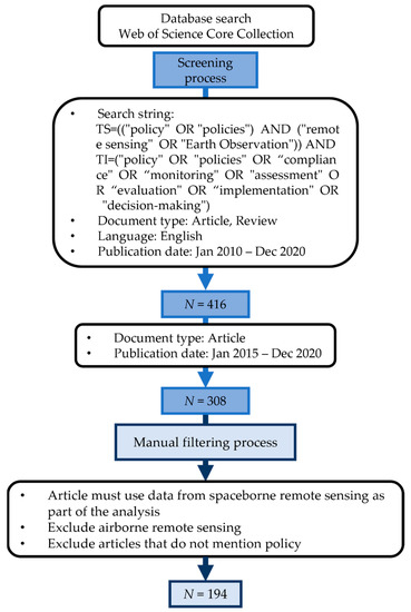 The literature search (Figure 1) was conducted using Web of Science (WoS) Core Collection from January 2010 to December 2020 (N = 416). This literature search showed an increase in the number of published papers per year within the time range, with two distinct leaps in the increase in publications in 2015 and 2019 (Figure 2) Therefore, and to narrow down the number of relevant articles, we focused the review paper on publications of the years 2015 to 2020. We restricted the literature to articles written in English. All other types of literature (e.g., grey literature) are excluded from this review. Further, articles had to meet certain criteria to be considered for the review, namely that they must (i) use data from spaceborne RS for their analysis, meaning that articles solely using airborne RS were not considered, and (ii) mention at least a policy relevance of their results or methodological approach. With this defined selection process, we aimed at applications of RS for policy that are feasible from a methodological perspective, i.e., with a reviewed methodical approach and published in peer-reviewed literature, even though we are aware that applications of RS regarding the science–policy interface which have been published outside of peer-reviewed literature, in languages other than English, or use RS other than spaceborne RS may have been missed. In the end, the literature list encompassed 194 articles Figure 1 provides an overview of the search string, eligibility criteria, and screening process applied.