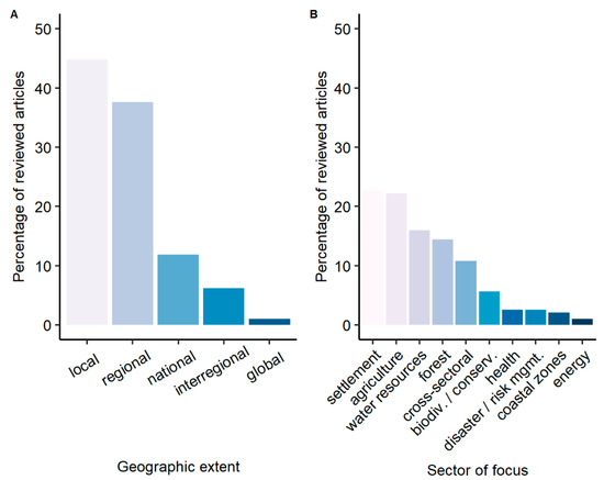 The most common sector is settlement (23%), followed closely by agriculture (22%). Other important sectors are water resources (16%) and forest (14%) (Figure 4B). All four sectors depict policy sectors of essential human needs. Remaining studies address the sectors biodiversity and conservation (6%), health, (3%) disaster and risk management (3%), coastal zones (2%), energy (1%) or have a cross-sectoral focus (11%).