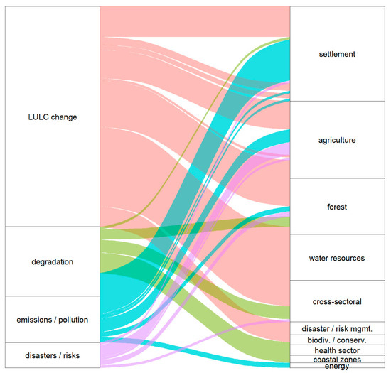 Across these sectors, various processes are analysed (Figure 5). The most frequently investigated processes are LULC change (44%), degradation (14%), changes in emissions, pollution, and impairment (9%), and hazards, disasters, and risks (5%).