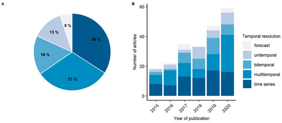 (A) Displayed are the percentages of different temporal resolutions applied in the reviewed studies. (B) Displayed is the frequency of temporal resolutions (here as the number of articles) used by the studies in this review according to their year of publication. Unitemporal: one time step is applied; bitemporal: comparison of two timesteps; multitemporal: time series analysis applying up to 9 timesteps; time series: time series analysis using >9 timesteps; forecast: prediction into the future.