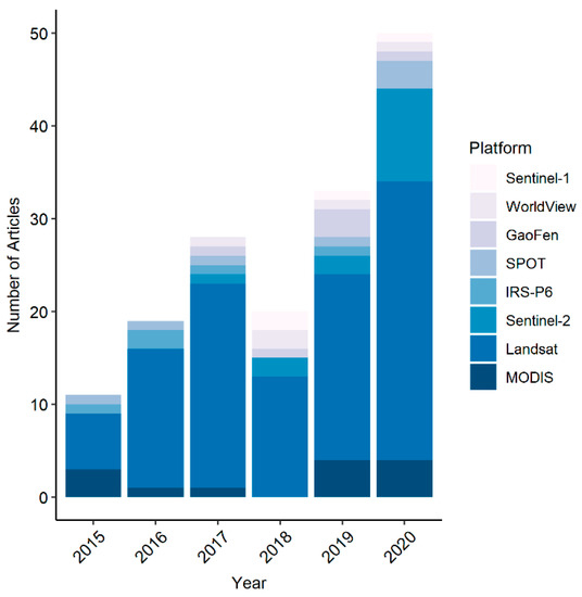 Most studies utilised free available higher resolution data from optical sensors, particularly Landsat (51%; e.g., [164,220]), followed by Sentinel-2 (7%; e.g., [130,150]). This is a stable trend over the years (Figure 7) and is expected since Landsat provides the longest time series with a higher resolution and is now complemented by Sentinel-2 since 2015. MODIS data, with a medium resolution, but also available for more than 20 years, was used by 6% (e.g., [122,123]). Sentinel-1 is the most frequently utilised SAR sensor (2%; e.g., [167,222]). A notable role was additionally played by national optical higher resolution satellite data such as the Indian IRS, the French SPOT, and Chinese GaoFen data (e.g., [53,64,103]; see Supplementary data, Figure S1, for an overview of all sensors used in this review).
