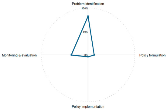 In accordance with the degree of policy focus of the studies, we found that most of the studies (83%) could potentially contribute to the “knowledge building/problem identification” stage of the policy cycle (Figure 8, here described as “problem identification”). The second most important potential contribution towards the policy cycle was the stage “monitoring and evaluation” (36%), while 13% and 4% of the studies could provide information to the stages “policy formulation” and “policy implementation”, respectively.
