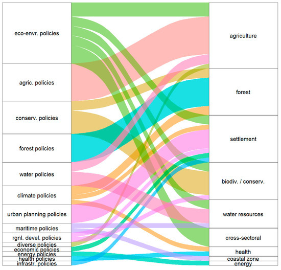 Investigated policies according to their affiliated policy field (left column) and their application in the different sectors (right column). The thickness of the connecting lines correlates to the number of different policies investigated.