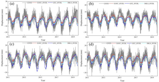 3.1. Comparison of Different HYDL Time Series with GNSS
