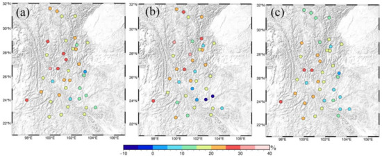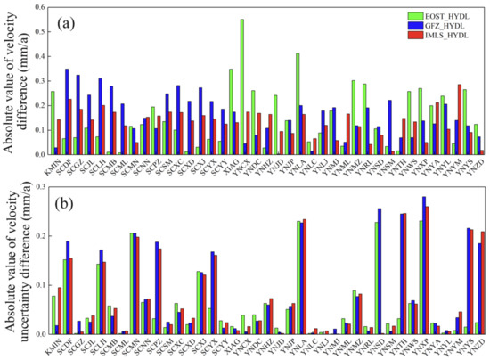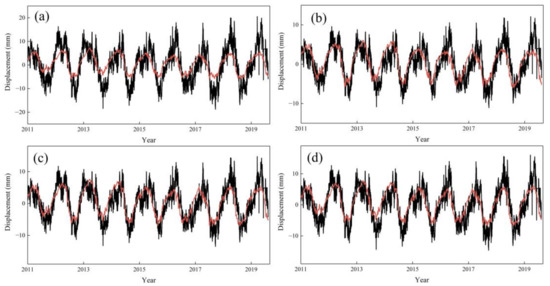 - Both HYDL time series and GNSS vertical time series show an obvious seasonal variation. The value of correlation between the GNSS vertical time series and EOST_HYDL, GFZ_HYDL, and IMLS_HYDL was 0.27~0.74, 0.27~0.75, and 0.25~0.73 with a mean value of 0.6, 0.6, and 0.54; the value of RMS reduction was 2~31%, −10~32%, and 1.5~27% with a mean value of 18.9%, 16.7%, and 16% after removing EOST_HYDL, GFZ_HYDL, and IMLS_HYDL time series from the GNSS, respectively. Compared with GFZ_HYDL and IMLS_HYDL, EOST_HYDL had the most positive effect on seasonal variations in GNSS vertical time series in the Chuandian region.