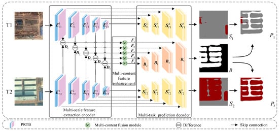 To overcome the difficulty faced by CNN in handling bi-temporal features and to better leverage its feature extraction powers for SCD, we propose a method based on CNN and Transformer called symmetric multi-task network (SMNet) that not only locates changed areas but also identifies the type of change. First, to extract the local and global information from bi-temporal remote sensing images, a hybrid PRTB backbone composed of PR and TB is built [22], which extracts different hierarchical features. Then, a novel multi-content fusion module (MCFM) [23] is used to strengthen the change-related features obtained by subtracting the extracted corresponding hierarchical features. Finally, we use the multi-task prediction branches (i.e., two semantic and one change branches) to obtain SCD results. To improve overall network performance, the multi-task loss function is jointly used to supervise training. Extensive experiments on the SECOND and Landsat-SCD dataset demonstrate that our proposed method obtains better accuracy than compared methods. The main contributions of this research are as follows: