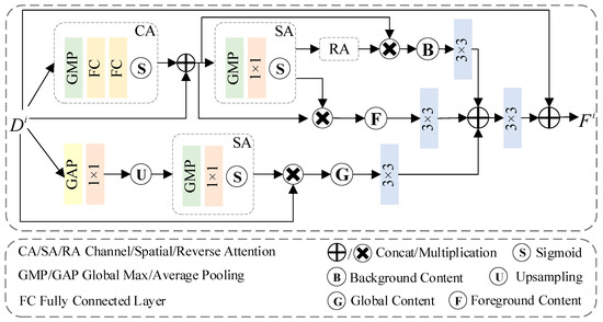First, the difference feature, Di∈ (C, H, and W are the channel dimension, height, and width of the feature), is fed into the CA to reduce redundant information. The specific formula is as follows: