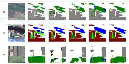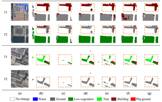 As shown in rows 1 and 2 of Table 3, compared with the baseline, the addition of the multi-task loss achieves a gain of 0.34% and 0.73% for mIoU and Sek, respectively. This indicates that the multi-task loss improves semantic expressability via co-supervised model training. The third row of Table 2 shows that the addition of the PRTB backbone achieves significant improvements in all metrics, which is due to that our PRTB backbone considers more global information and context information of the model. From the last row of Table 2, introducing the MCFM increases the mIoU value from 71.50% to 71.95% and the Sek value from 19.45% to 20.29%, respectively. This illustrates that the MCFM is effective in highlighting the boundaries of change areas. Some of the visualization results are shown in Figure 9, which illustrates the improvements in terms of fewer missed and false detection. In particular, the ability to distinguish ground, low vegetation, and tree categories have been significantly increased.