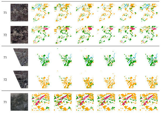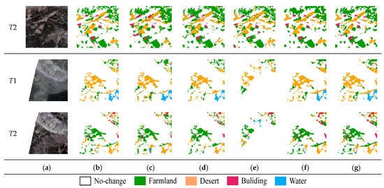 The Landsat-SCD dataset [39] is made up of Landsat images collected between 1990 and 2020. The observation area is Tumshuk, Xinjiang, China. The dataset consists of 8468 pairs of images, each having a fixed size of 416 × 416 pixels with a resolution of 30 m. The dataset relates a no-change class and four land-cover classes, including farmland, desert, buildings, and water. Figure 5 shows sample images from the Landsat-SCD dataset. The dataset contains many complex detection scenes, where the buildings are small and scattered. Changed pixels account for about 19% of the total, which provides a realistic evaluation dataset for SCD methods.