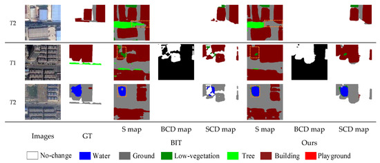 Figure 8 presents the intermediate results of the BIT and the proposed method on the SECOND. It can be seen that BIT shows obvious misjudgment in the recognition of semantic types, which may be caused by its transformer receiving only the lowest semantic features from the CNN, resulting in inadequate semantic information. The proposed method not only effectively reduces the response to unrelated information and improves the classification ability of different objects via the PRTB backbone, but it also successfully leveraged the MCFM module to accurately detect change regions and improve boundary expressability. It is worth noting that in the case of extreme label imbalances, water is detected more accurately by SMNet, which demonstrates that the proposed method achieves excellent performance for remote sensing image SCD.