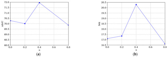 The loss function provides effective supervision information for network training, which has a significant impact on network performance. In this paper, α is introduced in the multi-task loss to balance the loss values between the semantic and change branches. In the process of training, the larger value of α indicates more supervision information from semantic branches to the model. To analyze the sensitivity of α, we chose four sets of values from 0 to 0.8 for our experiments. Figure 10 shows the effect of different α values in the multi-task loss on each evaluation metric. It can be seen that all curves of the SECOND dataset reach the best value when α = 0.5, which indicates that semantic loss and binary change loss play equal roles in the co-supervision network training. However, all evaluation metrics have the lowest value when α = 0.8, which illustrates that semantic supervision is greatly important for remote sensing image SCD.